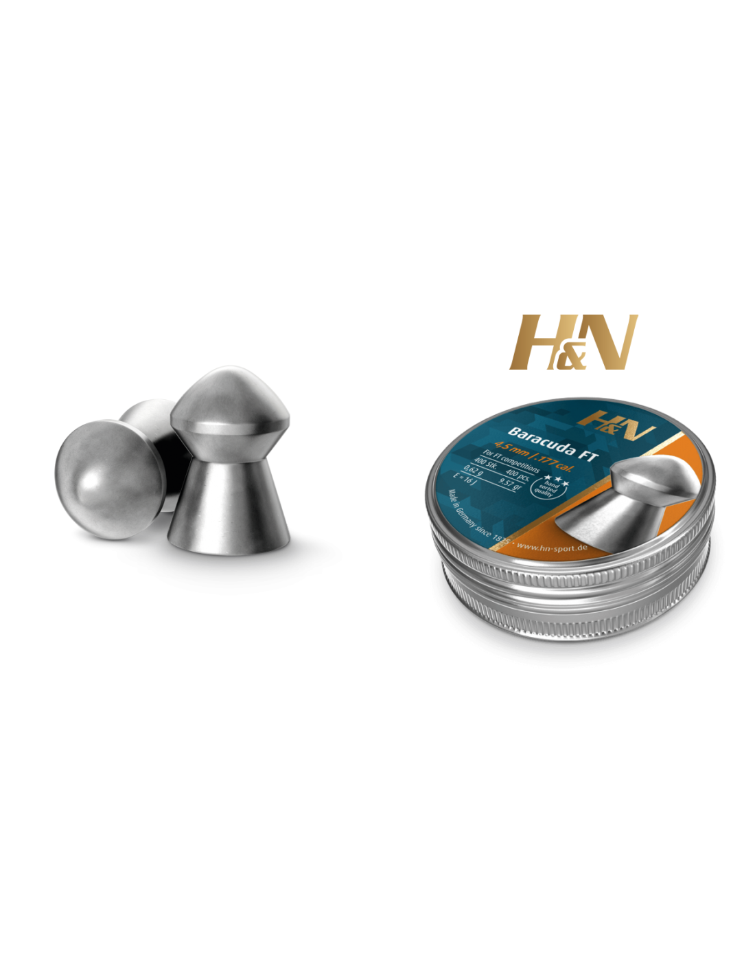 H&N Barracuda FT: Balín de competición optimizado para Field Target y Hunter Field Target. Los mejores resultados se obtienen con las armas de aire de precisión con potencia de 16 j. Cada lote de producción está calificado en nuestro rango de prueba electrónica de 50 m. Trás 5 disparos, debe alcanzar una agrupación de 12 mm de diámetro máximo (C-T-C), después de 20 disparos tiene que ser de 20 mm.