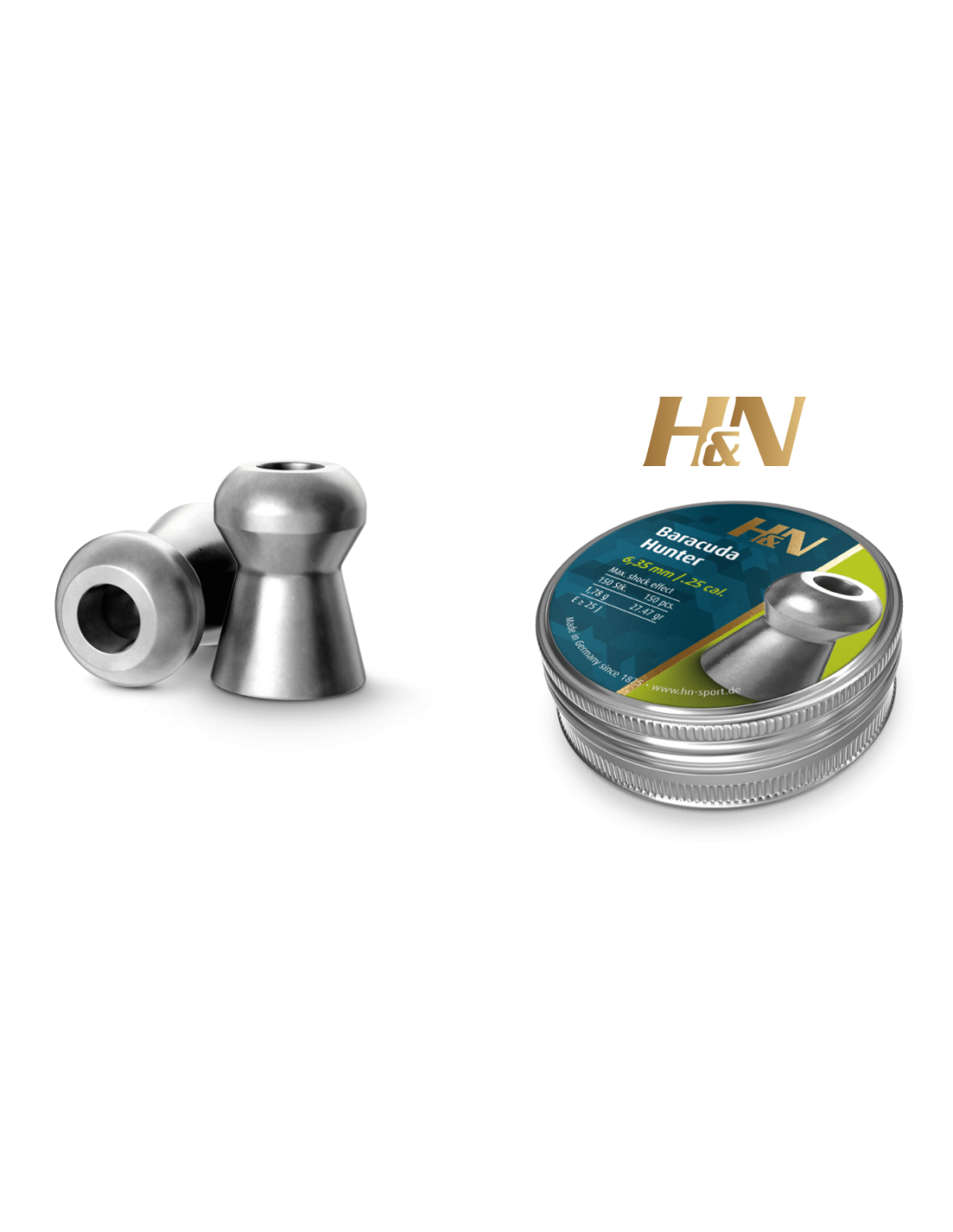 HN Baracuda Hunter: Balín de caza pesado, precisión extraordinaria para distancias largas. El Baracuda con unas propiedades aerodinámicas mejoradas para un máximo poder y profundidad de perforación y deformación controlada de la bala. Agrupaciones pequeñas. Emplomado muy bajo y agrupaciones homogéneas gracias a la aleación especial y engrase. Liso, punta hueca profunda.