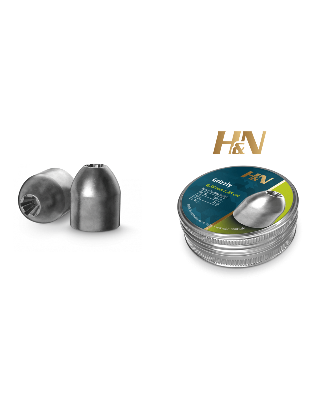 HN Grizzly: Un proyectil de caza pesado fabricado para carabinas de aire comprimido potentes. La punta hueca en forma de estrella garantiza una deformación en hongo ideal y la máxima transferencia de energía. Su base hueca ofrece el máximo ajuste en el cañón y un óptimo uso de la energía.