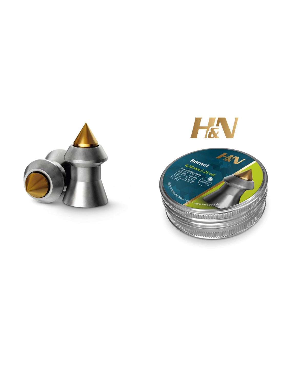 HN Hornet: Balín de caza de peso medio, muy preciso para distancias medias. Gran poder perforante y aerodinámico gracias a la punta de metal. Expansión extraordinaria y alta profundidad de penetración. Balín liso con punta de latón incorporada. Recomendado para PCP multitiro.