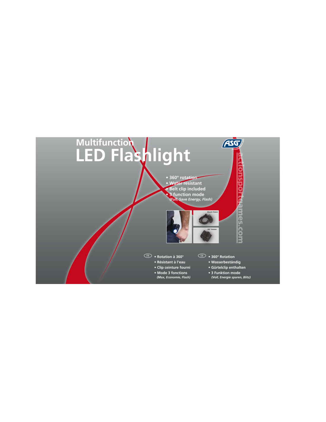 Linterna LED multifunción con 3 modos de funcionamiento, potencia total, baja potencia o efecto estroboscópico. Puede montarse en la mayoría de las armas de airsoft con raíles. Se incluyen 2 soportes especiales, ambos le permiten encender o apagar rápidamente la linterna. Un soporte de cinturón que mantiene la linterna en el cinturón ya sea para el transporte o para proporcionar luz de manos libres, puede girar 360 grados. Un soporte de la barra de la manija permite que la linterna se monte en una bicicleta, para proporcionar iluminación mientras se conduce.