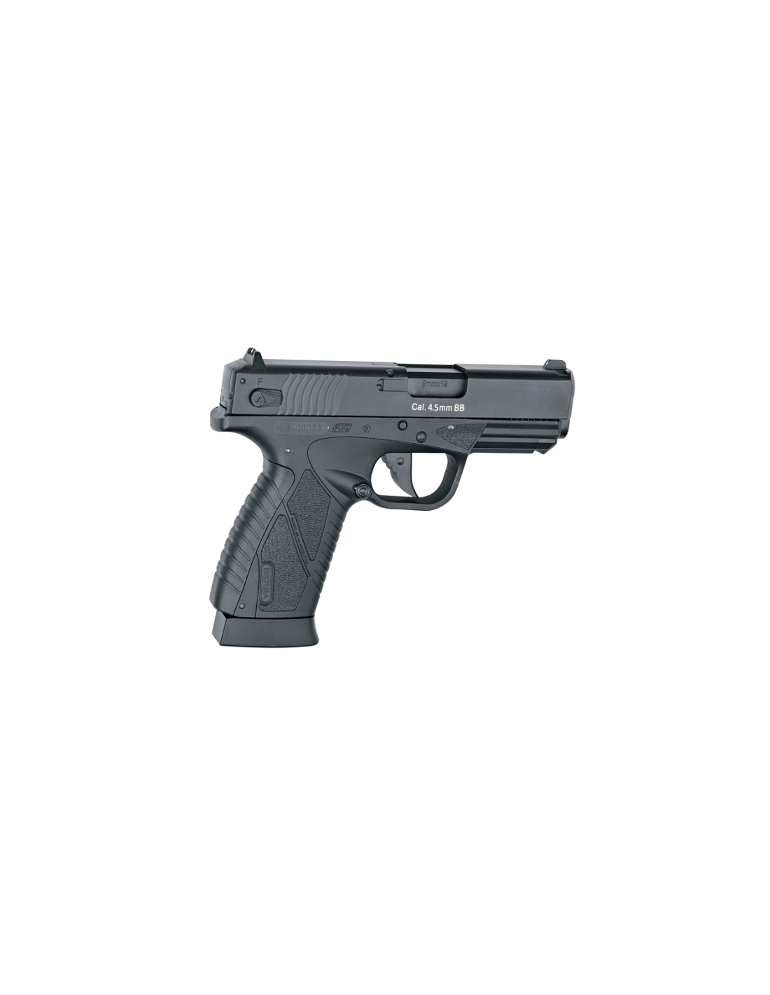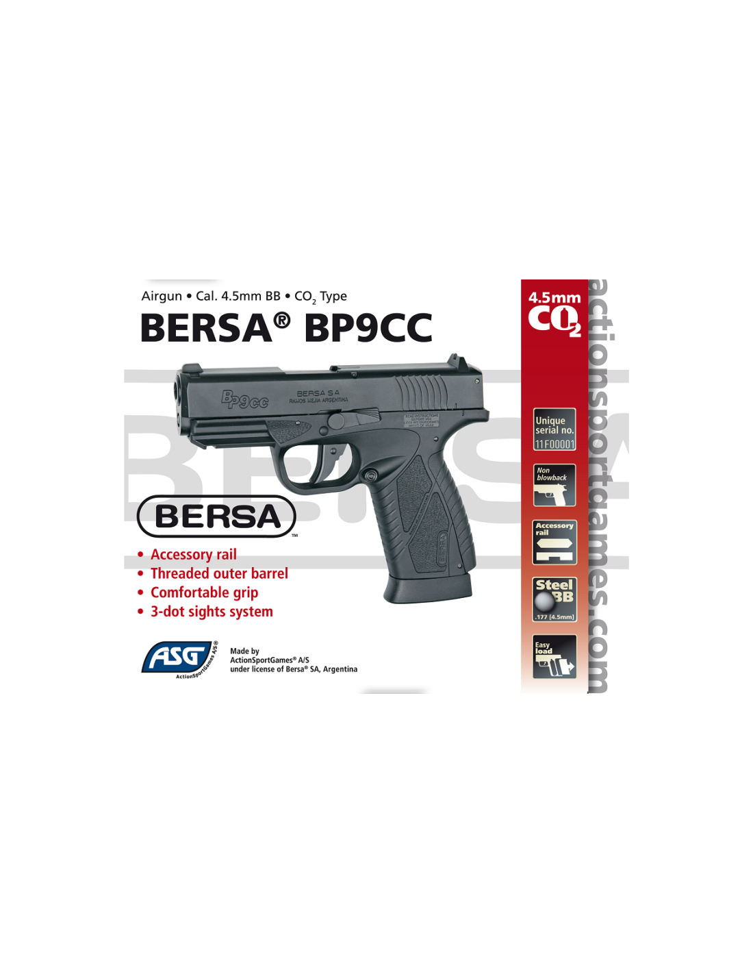 Esta BP9CC (Concealed Carry) es una pistola de aire comprimido semiautomática sin retroceso de 4.5 mm con licencia completa de BERSA. Es una pistola ligera, compacta y ultra delgada, con un diseño ergonómico que mejora la línea de visión. Se alimenta con una cápsula de CO2 de 12 g almacenada en el grip utilizando el sistema easyload y los BB se colocan en el cargador extraible. Raíl picatinny integrado que permite el montaje de láseres o luces tácticas. El grip y la corredera metálica llevan marcas BERSA auténticas y cada arma viene con un número de serie único. Sistema triple dot sight, cañón con rosca para utilización de silenciador e incluye también una palanca opcional de seguridad. Utiliza cargador ref. ASG17305.