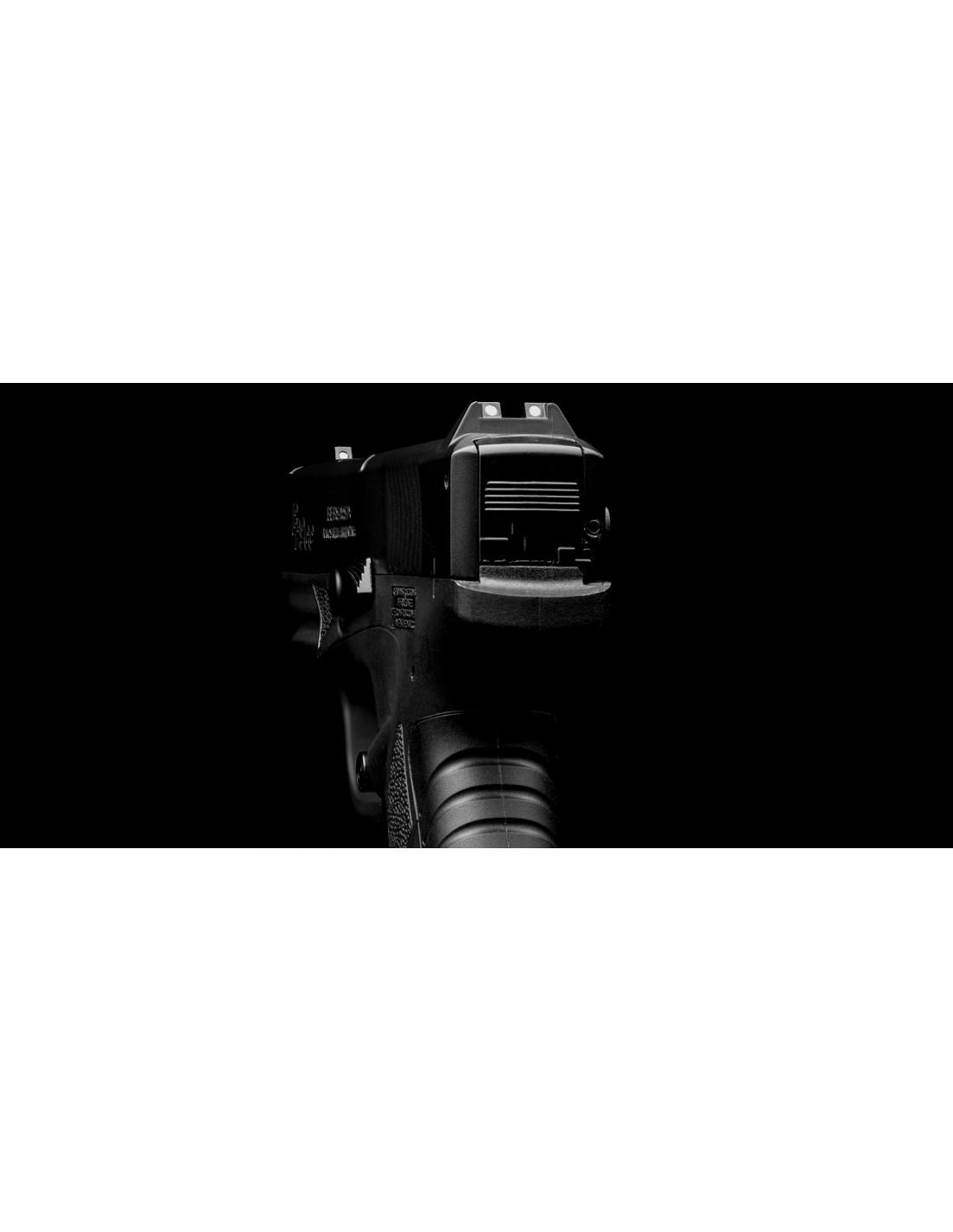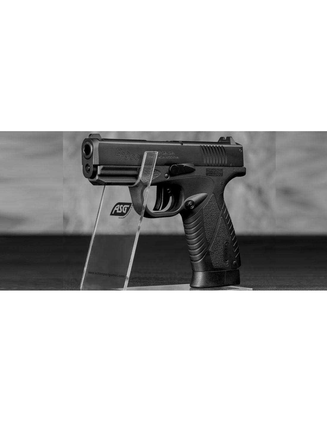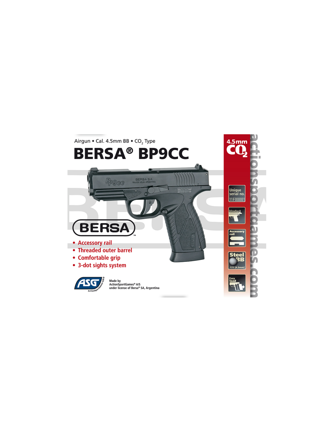 Esta BP9CC (Concealed Carry) es una pistola de aire comprimido semiautomática 4.5 mm Blowback con licencia completa de BERSA. Es una pistola ligera, compacta y ultradelgada, con un diseño ergonómico que mejora la línea de visión. Se alimenta con una cápsula de CO2 de 12 g almacenada en el grip utilizando el sistema easyload y los BB se colocan en el cargador extraíble. Rail picatinny integrado que permite el montaje de láseres o luces tácticas. El grip y la corredera metálica llevan marcas BERSA auténticas y cada arma viene con un número de serie único. Sistema triple dos sight, cañón con rosca para utilización de silenciador e incluye también una palanca opcional de seguridad. Utiliza cargador ref. ASG17305.
