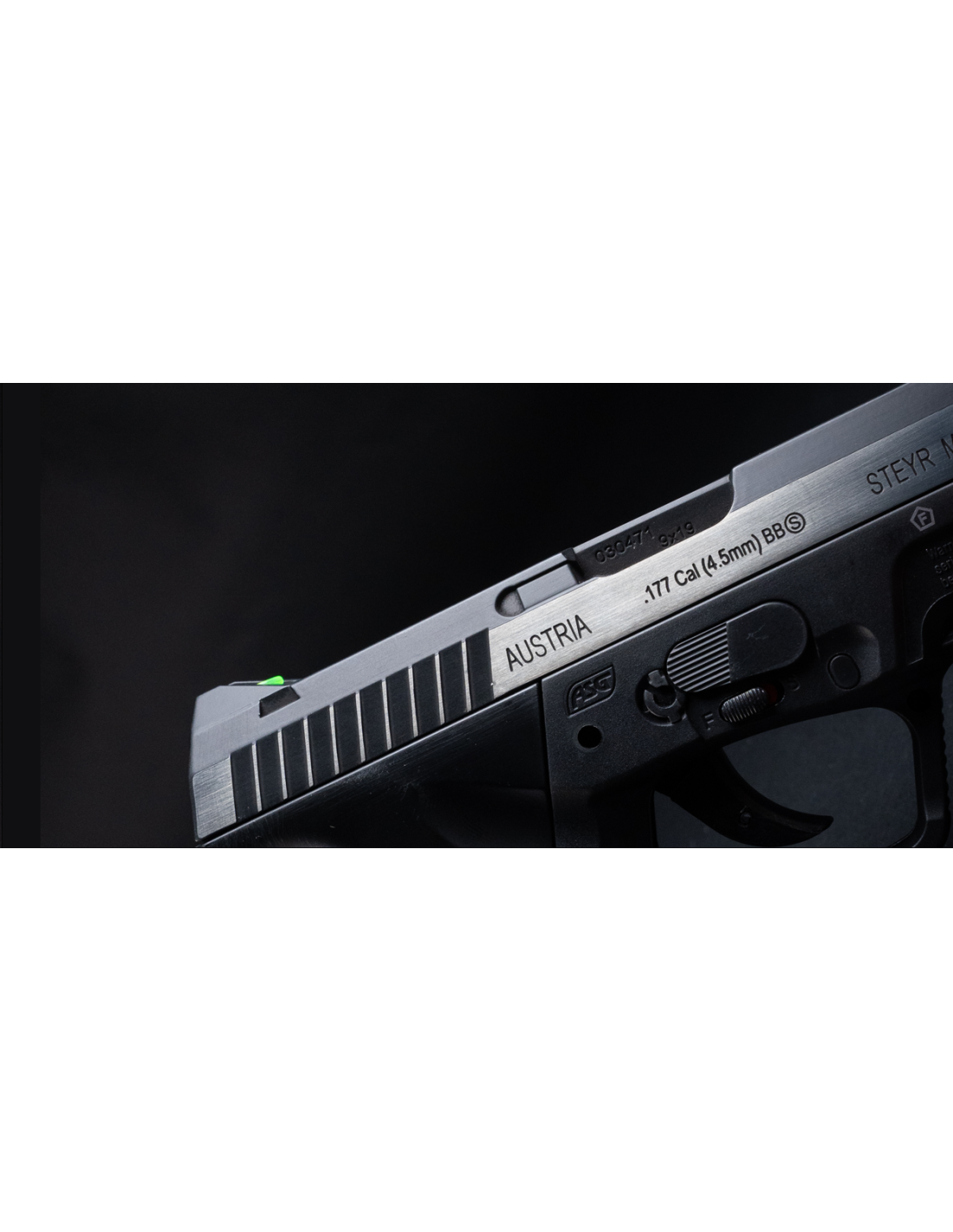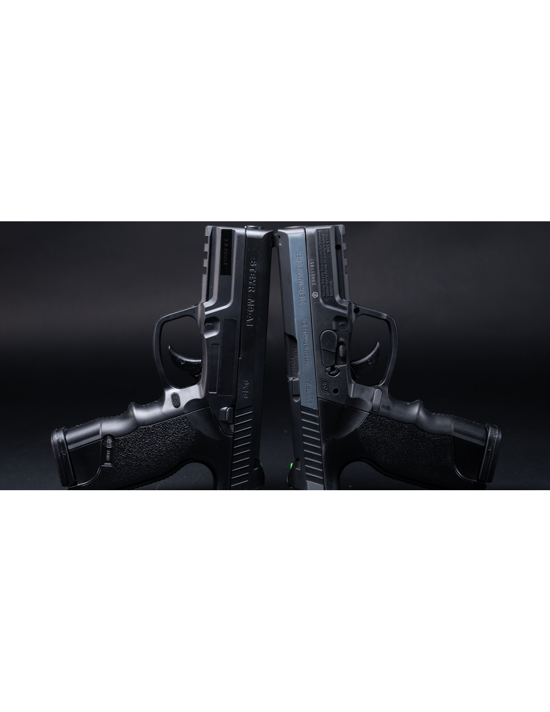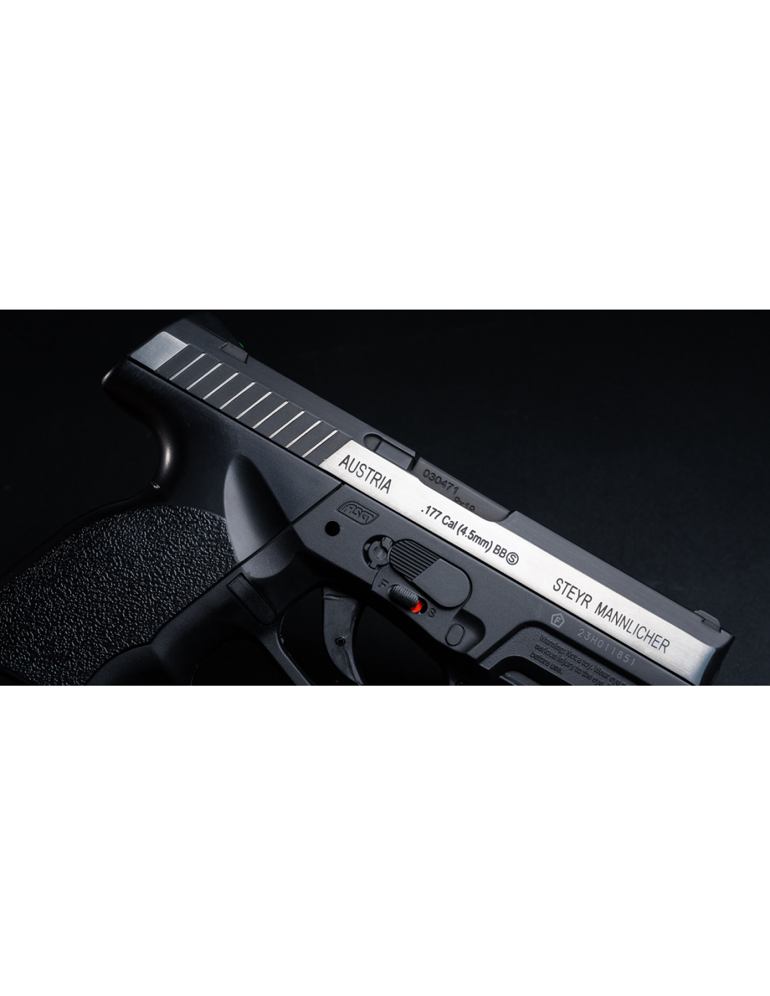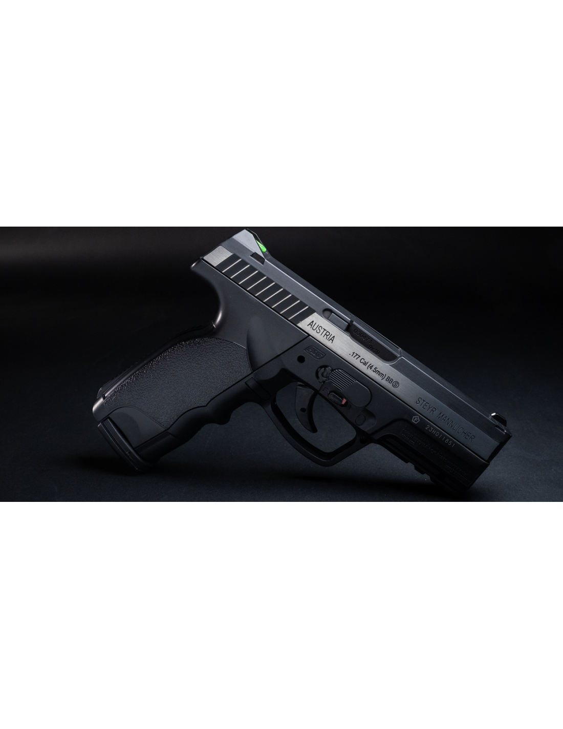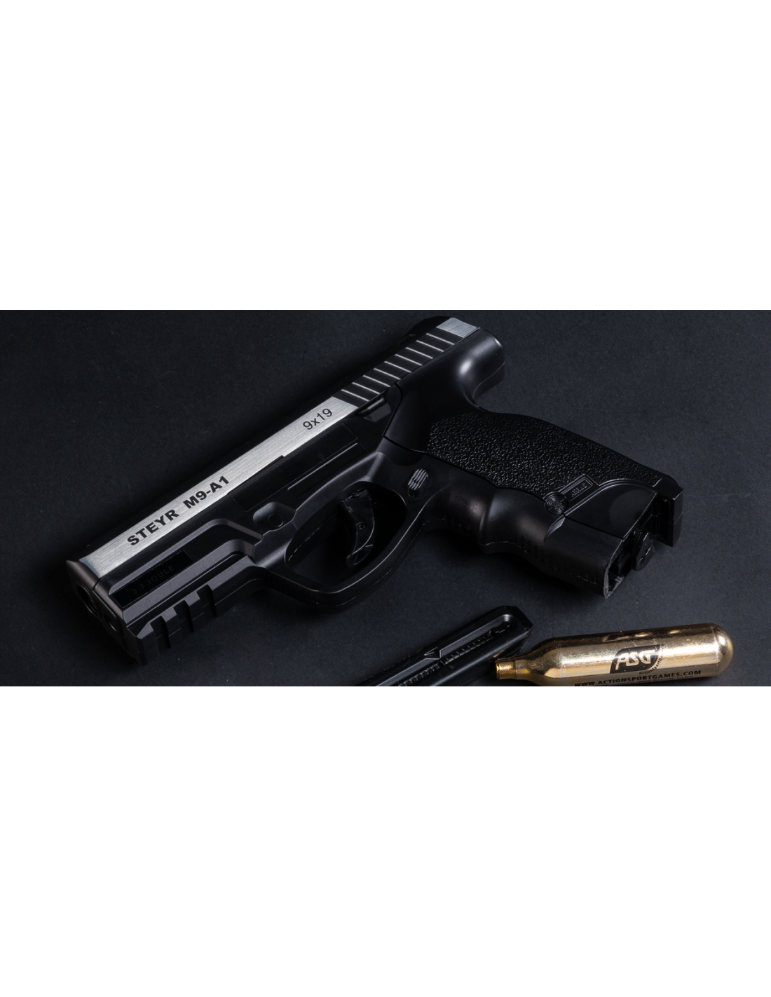 Versión de aire comprimido de la última pistola Steyr Mannlicher: la M9-A1. Elegante acabado de doble tono con marcas auténticas. Una de las armas de aire de tiro más resistentes. La empuñadura ergonómica ha sido diseñada en un ángulo de 111 grados para mejorar la comodidad de tiro, con raíl weaver y mira trasera de fibra óptica hace que esta pistola sea muy cómoda. En el cargador drop-out se almacenan 19 BB's y la cápsula de 12g de CO2 se coloca en el grip easyload y se puede cambiar fácilmente.