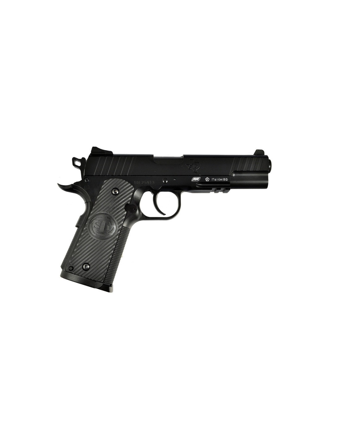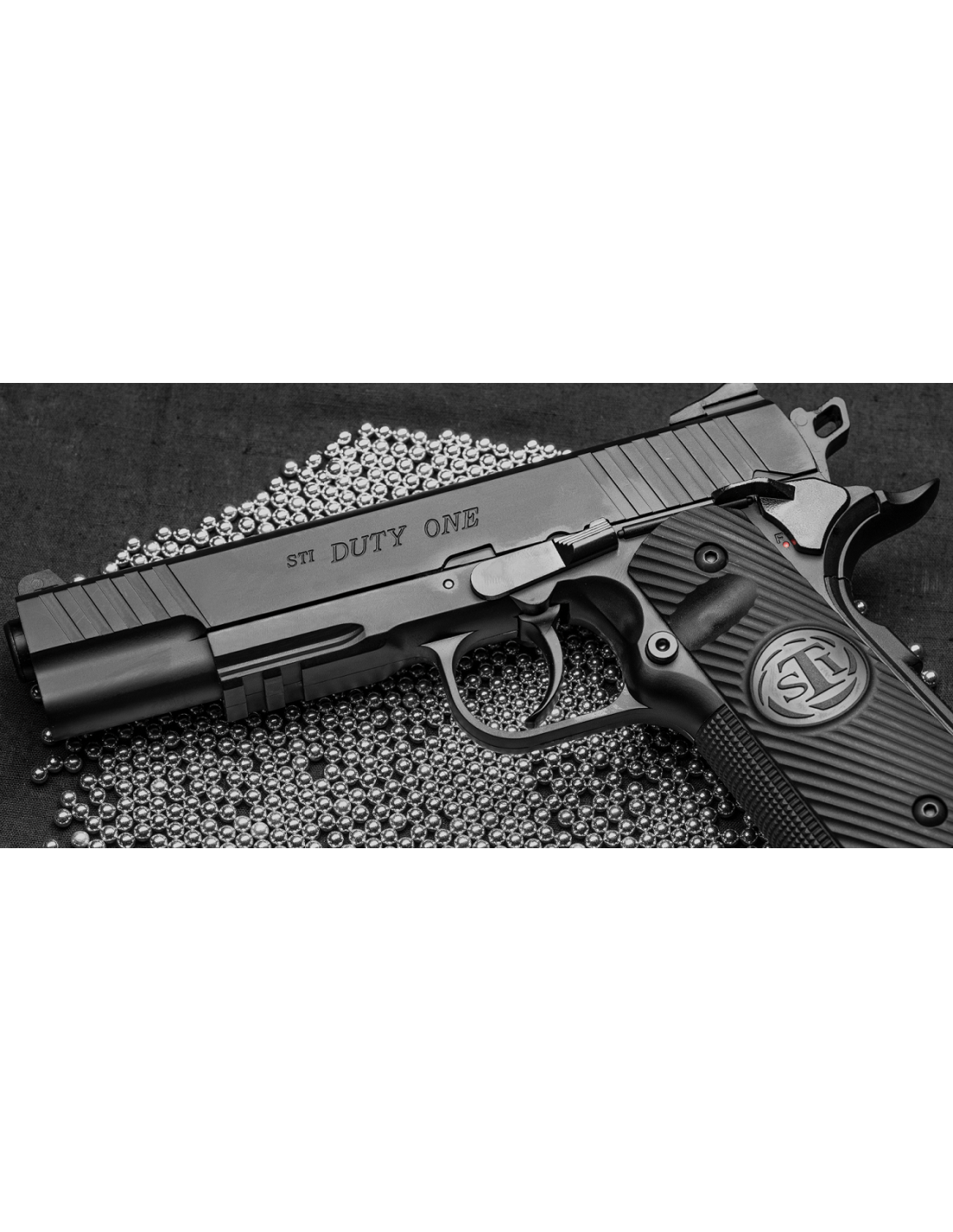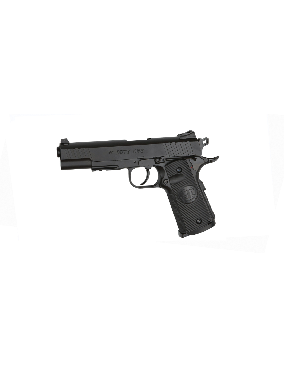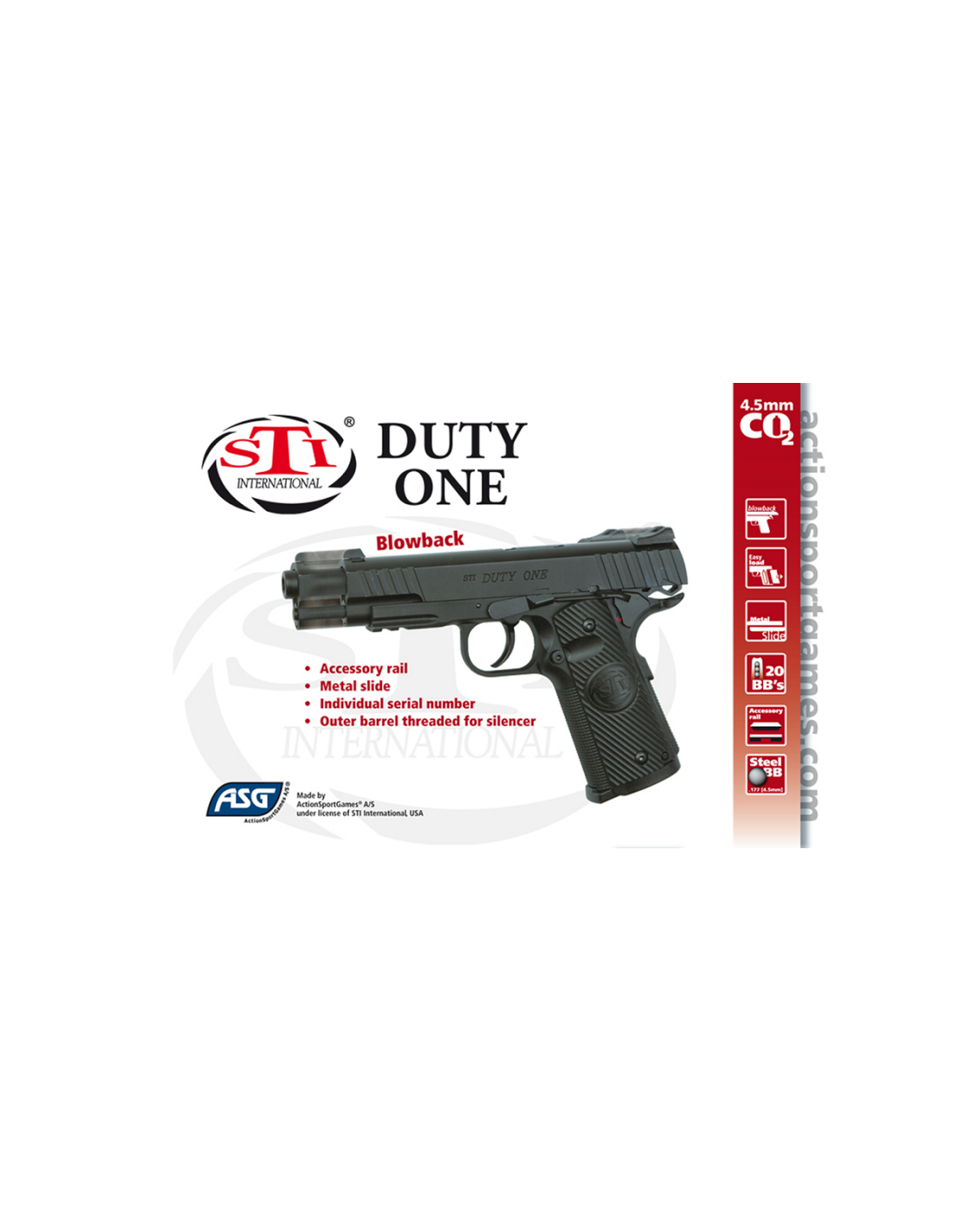 Esta versión Blowback DUTY ONE está totalmente autorizada por el famoso fabricante de armas pequeñas STI® International, con sede en Texas, EEUU. Los BB de acero de 4,5 mm (.177) se almacenan en el cargador drop-out y se alimentan con una cápsula de CO2 de 12 g que se mantiene inteligentemente alojado en el grip de la pistola gracias al sistema easyload. La pistola de aire es semiautomática y se basa en el modelo clásico 1911, pero STI® ha actualizado y cambiado el diseño y muchas de las funciones. El cuerpo tiene un rail weaver delantero integrado. La empuñadura está marcada con un logotipo de STI® y la cola de castor asegura una sujeción perfecta. Además, la pistola tiene un número de serie único y la corredera de metal tiene auténticas marcas STI®.