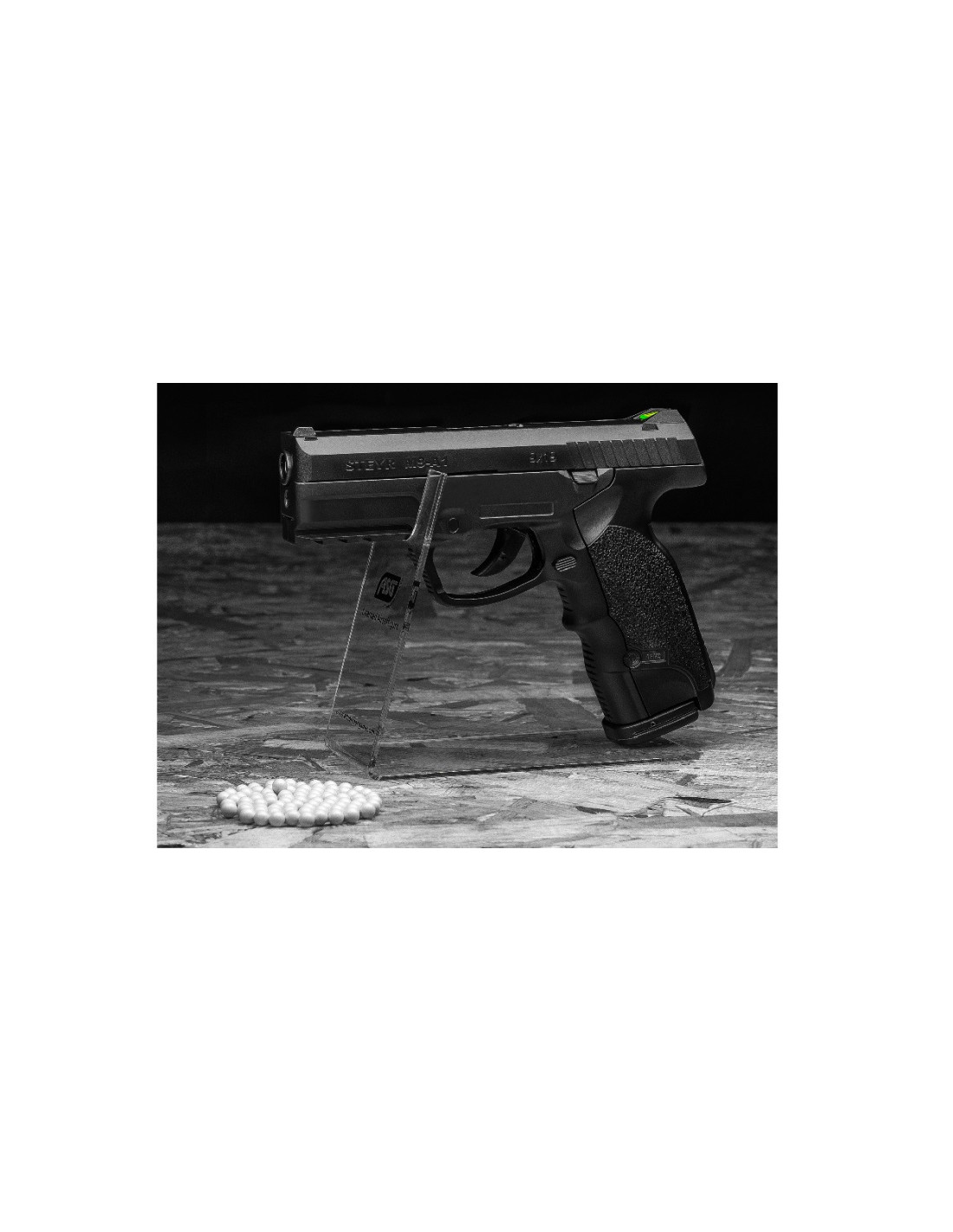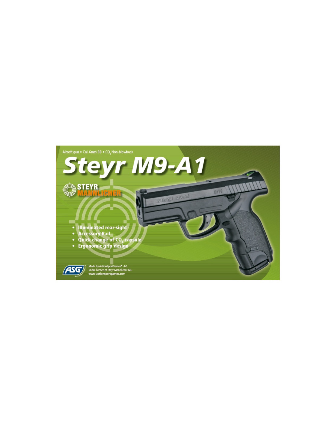 Esta pistola tiene licencia de Steyr Mannlicher, Austria. La empuñadura es ergonómica, la mira trasera iluminada y el rail de accesorios weaver / picatinny hacen que esta pistola sea muy cómoda con muchas posibilidades de actualización externa. La cápsula de Co2 12g se almacena en la empuñadura y se cambia fácilmente. Con 140 m / s (460 fps) ésta es una pistola muy dura de roer.