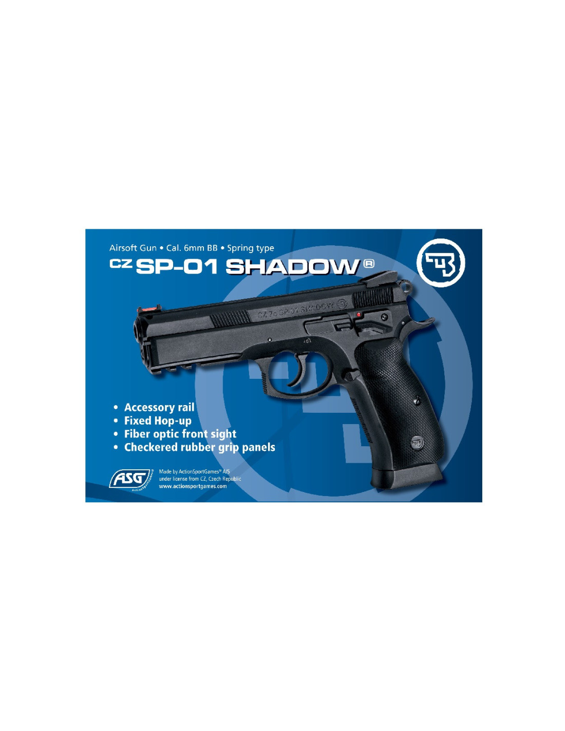 La CZ SP-01 SHADOW es una nueva pistola de Airsoft de muelle basada en la última generación de pistolas de CZ, diseñada a partir de las aportaciones de las fuerzas policiales, militares y policiales de todo el mundo, y con aportes adicionales de los tiradores de Team CZ . Esta pistola de muelle es liviana y fácil de usar, el grip ergonómico con paneles de agarre de goma a cuadros la hace acomodarse cómodamente bien en la mano. Cuenta con una mira frontal de fibra óptica y rail. Se puede colocar fácilmente una extensión de cañón quitando las tapas frontales. (Ver ref. ASG15924 y ASG15925).
