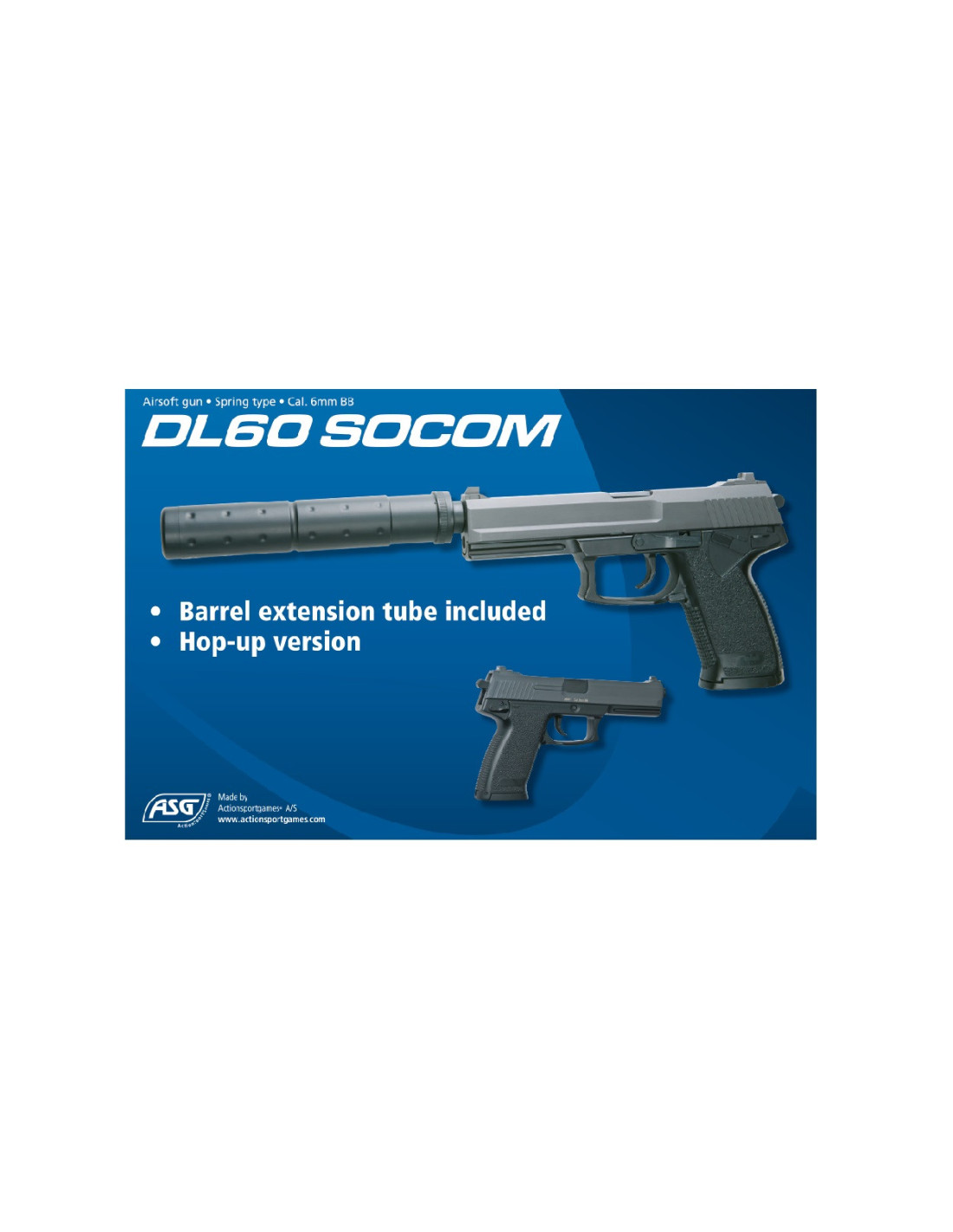 La más grande y más impresionante de las pistolas de muelle: la DL60 Socom incluye un tubo de extensión de barril que se parece a un silenciador. La pistola tiene un rail weaver / picatinny para accesorios. Esta pistola de peso pesado tiene Hop-up fijo y el cargador tiene una capacidad para hasta 27 BB.