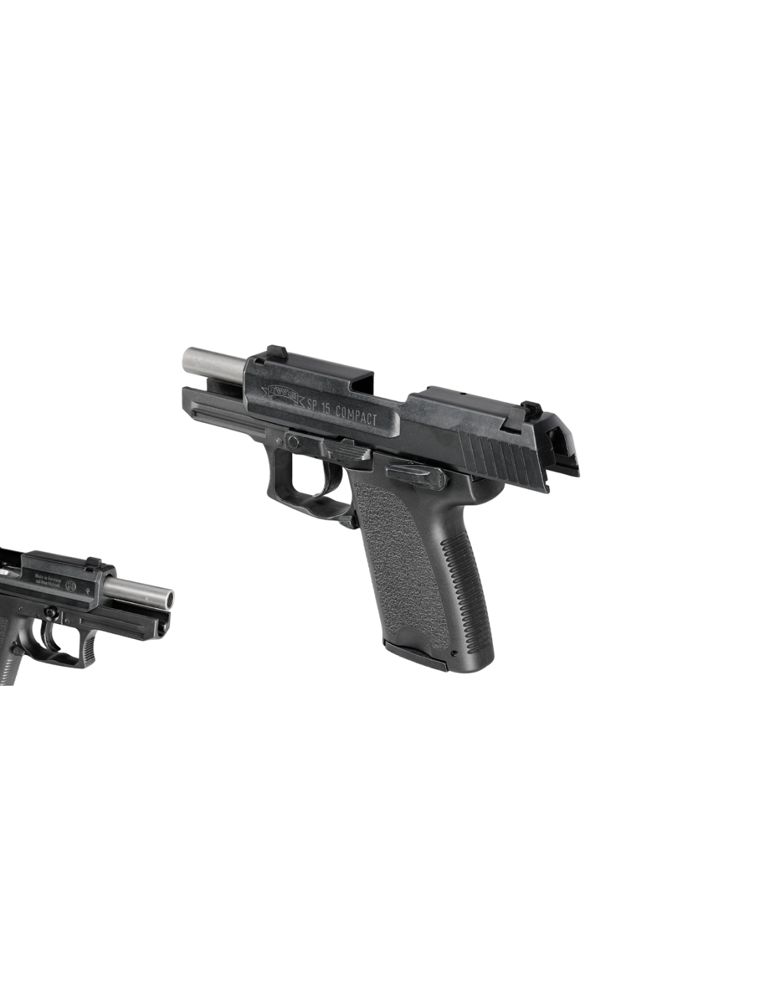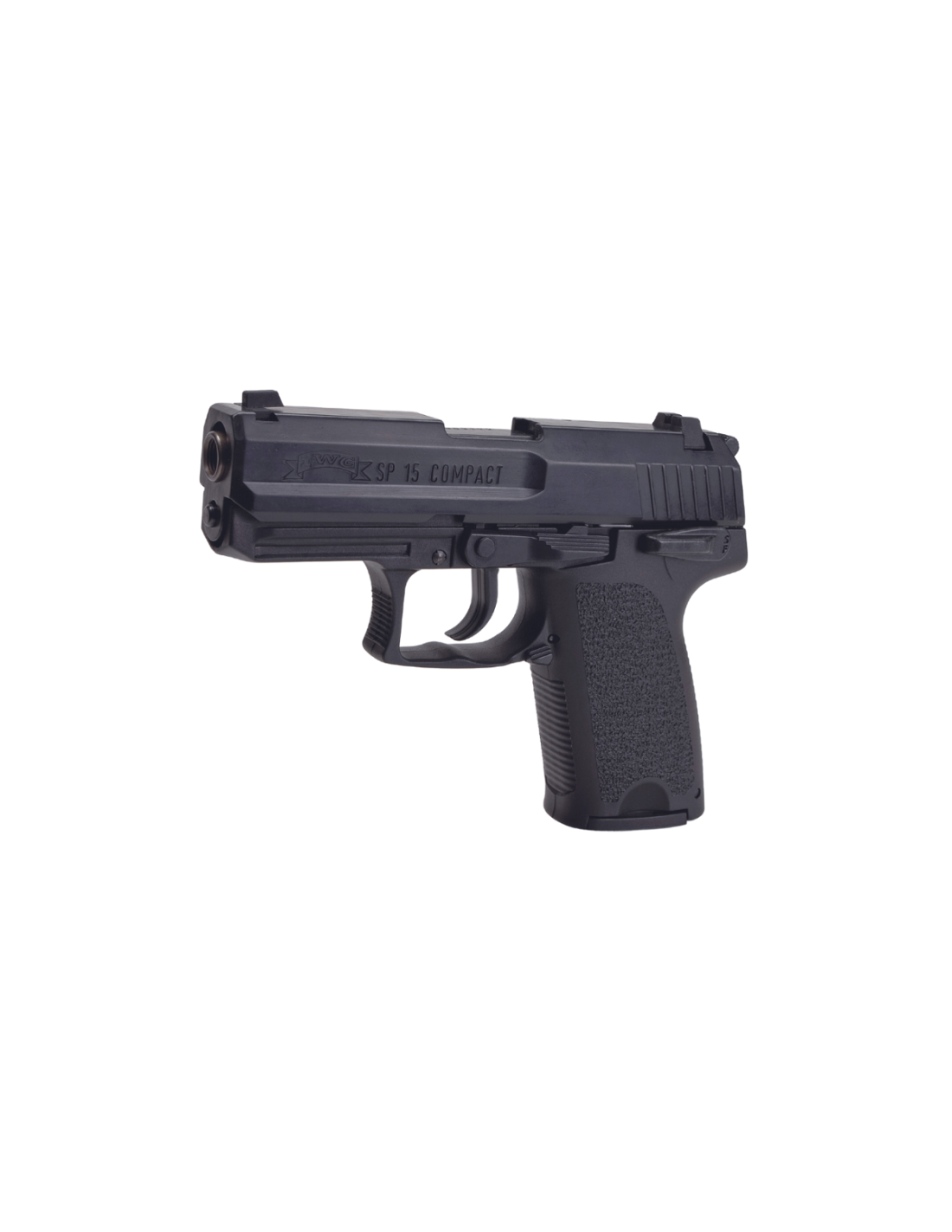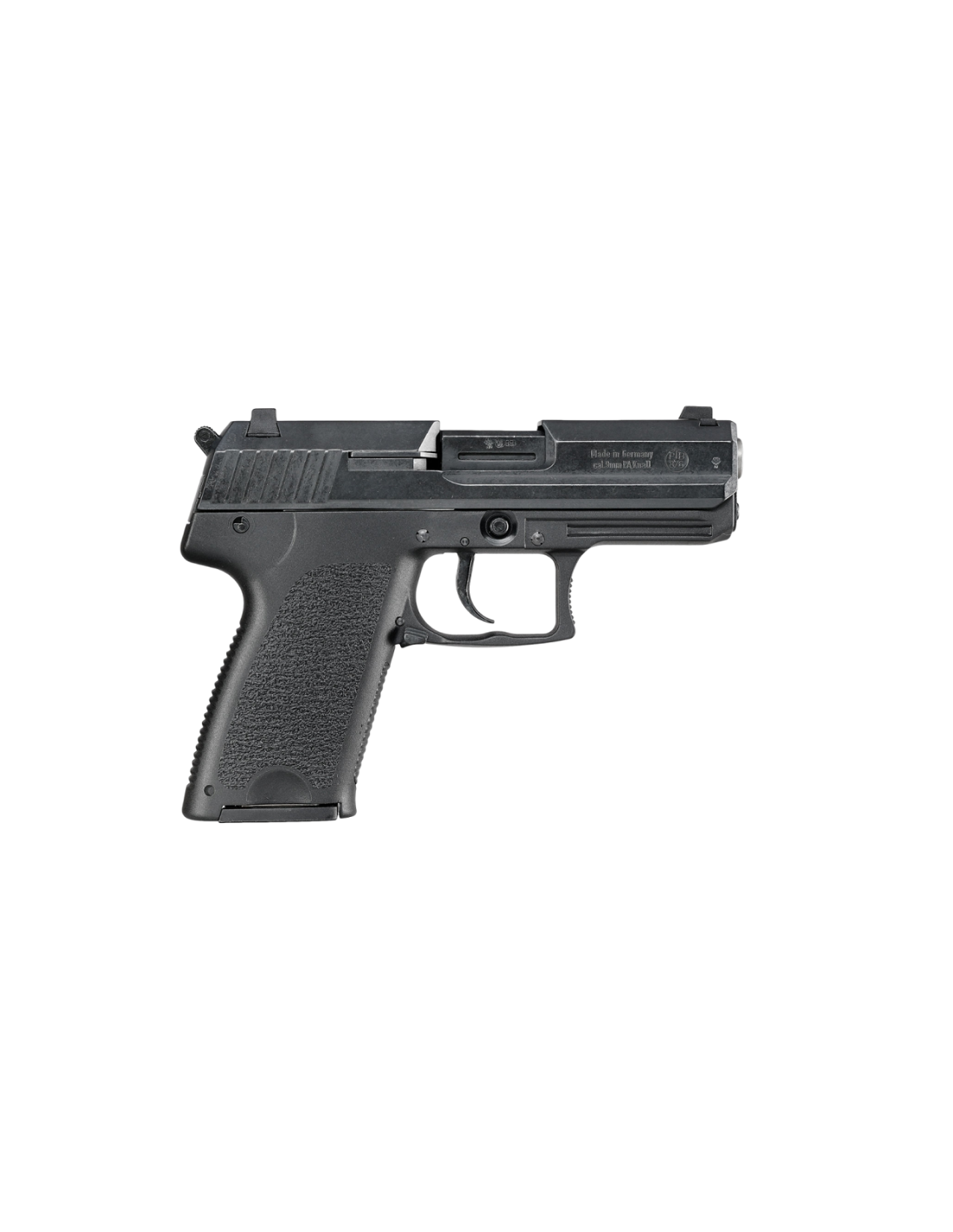Arma compacta de fogueo, calibre 9 mm P.A.K., inspirada visualmente en la famosa H&K USP. Dispone de cañón de acero, recámara metálica y cargador de acero inoxidable para 14 cartuchos, la empuñadura es de plástico color negro.