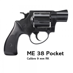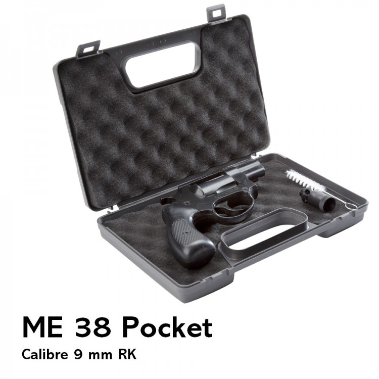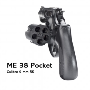 Revólver de fogueo en calibre 9 mm R.K. El pequeño y muy ligero ME38 Pocket es una réplica fiel del famoso S&W Modelo 36. Incluye: ME 38 Pocket. Cazoleta. Cepillo de limpieza. Instrucciones. Estuche. Características: - Disparos: 5. - Acabado: Bruñido negro. - Seguridad: Protección contra caídas. - Mira fija. - Cañón: 45 mm. - Longitud total: 155 mm. - Empuñadura plástica. - Peso: 555 g. - Cal.: 9 mm R Knall. IMPORTANTE: En cumplimiento de la legislación vigente, para adquirir un arma detonadora el comprador tiene que enviar por correo electrónico copia del DNI por ambas caras. Además, el comprador tiene que cumplir, como mínimo, una de las siguientes condiciones y enviar copia del documento que le acredite: 1/ Ser titular y poseer Libro de Coleccionista de armas. 2/ Ser titular y disponer de Licencia de armas en vigor. 3/ Ser titular y disponer de la acreditación para su uso en alguno de estos cuatro casos: Actividades deportivas, adiestramiento canino, espectáculos públicos y actividades recreativas o filmaciones cinematográficas y artes escénicas. Si no se envía la documentación indicada, el pedido no tiene validez.