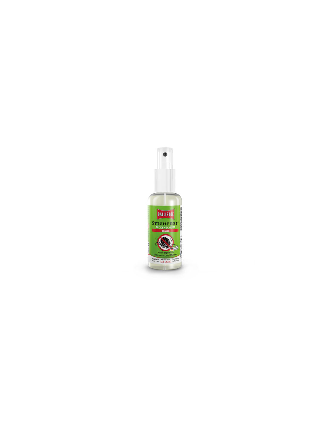Stichfrei Tick Protection ofrece protección duradera contra las picaduras de garrapatas hasta por 8 horas. Ballistol Stichfrei® Tick Protection fue desarrollado especialmente para amantes de la naturaleza, deportistas al aire libre, cazadores, silvicultores y familias. Gracias a su eficaz fórmula con icaridina (20 %), Ballistol Stichfrei® Tick Protection mantiene alejadas las garrapatas de forma fiable. Además, contiene ingredientes que no resecan la piel.
